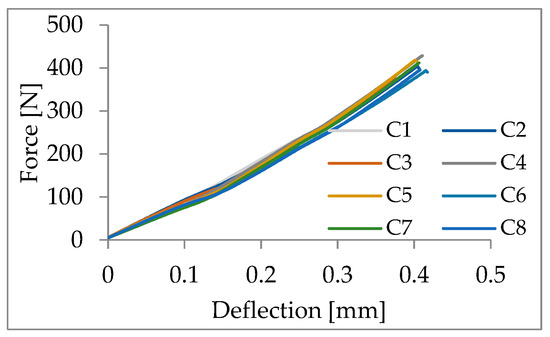 Four-point bending tests were carried out on circular sections containing four holes, using specimens of 99% pure alumina ceramic. Eight specimens were tested in total. Figure 6 presents the corresponding force–displacement curves.