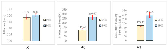 In the present study, the bending behavior of 99% and 95% pure alumina ceramic specimens was investigated. Figure 7 summarizes the main results: subfigure (a) shows the deflection, (b) presents the maximum force recorded, and (c) displays the corresponding bending strength for both materials. The data indicate that the higher-purity ceramic exhibits slightly greater bending resistance under the same loading conditions, highlighting the influence of material purity on mechanical performance.