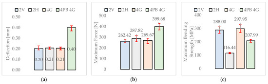 Deflection was nearly identical for the specimens subjected to 3PB with 2 holes arranged vertically (2V), 2 holes arranged horizontally (2H), and four holes (4G) (~0.20–0.21 mm), while 4PB specimens with four holes (4PB 4G) showed a significantly higher value (0.40 mm), indicating reduced stiffness. The maximum force was greatest for 4PB with four holes (399.68 N), far exceeding the other configurations (262–288 N), indicating improved load distribution. In contrast, the maximum bending strength was highest for 4G (297.95 MPa) and 2V (288.00 MPa), intermediate for 4PB 4G (207.99 MPa), and lowest for 2H (116.44 MPa). These results highlight that 4G and 2V optimize bending strength, 4PB 4G enhances load capacity at the expense of strength, and 2H is the least favorable arrangement.