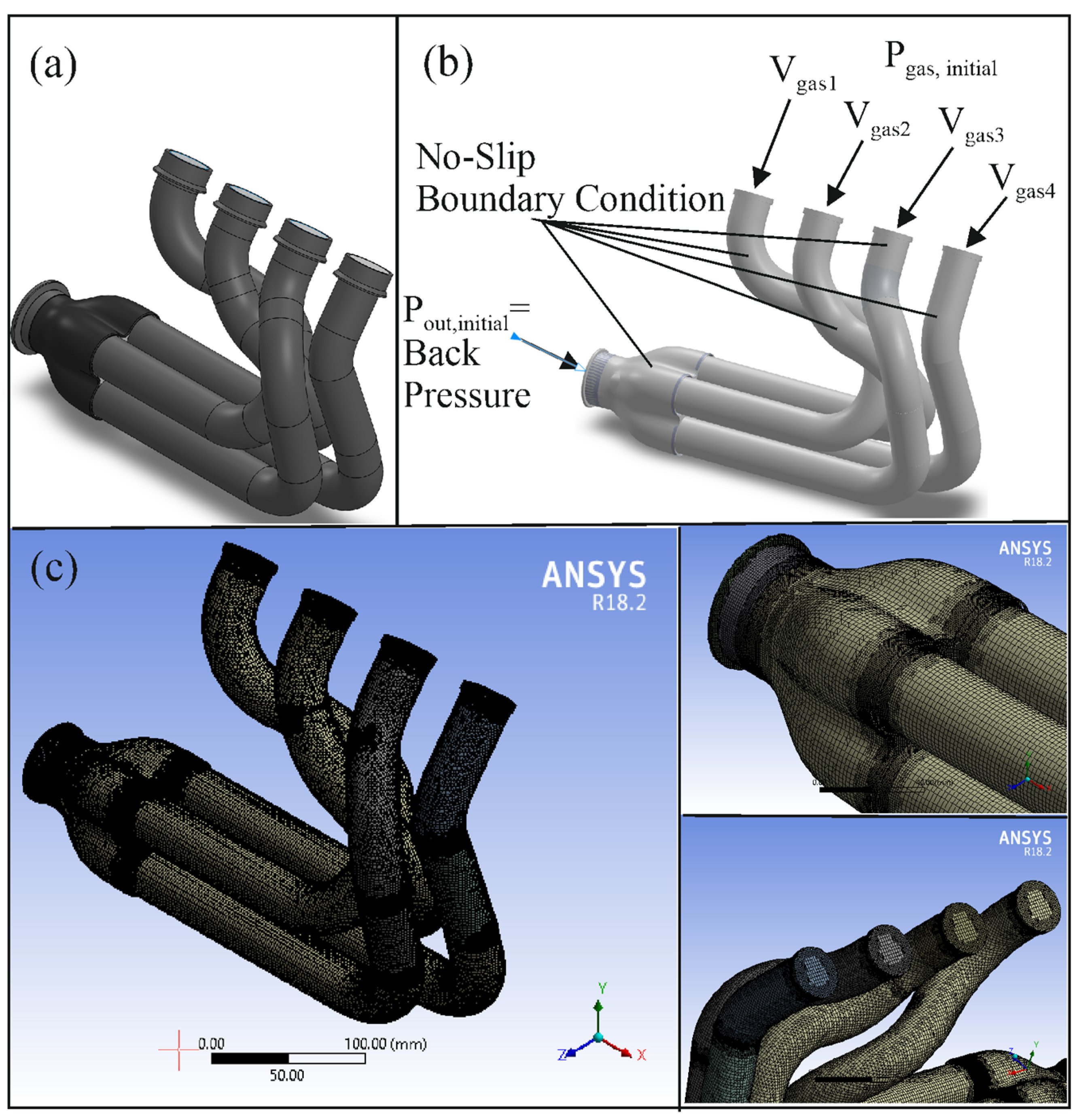 Figure 1 shows the solution domain with the boundary conditions. More specifically, that figure shows the exhaust system and the 3D volume of exhaust gases, with the boundary and initial conditions within the exhaust (the solution domain simulated). In addition, the discretized solution domain, including cut-cell elements at the outlet of the manifold, the entrance of exhaust gases into the manifold, and the entire 3D volume simulated, is presented. The simulations were conducted in ANSYS Fluent using the k-ε model. ANSYS Fluent uses two-equation models to evaluate the behavior of turbulent bounded flows. It basically makes the turbulent velocity and the lengths to be evaluated independently available through two transport equations [
