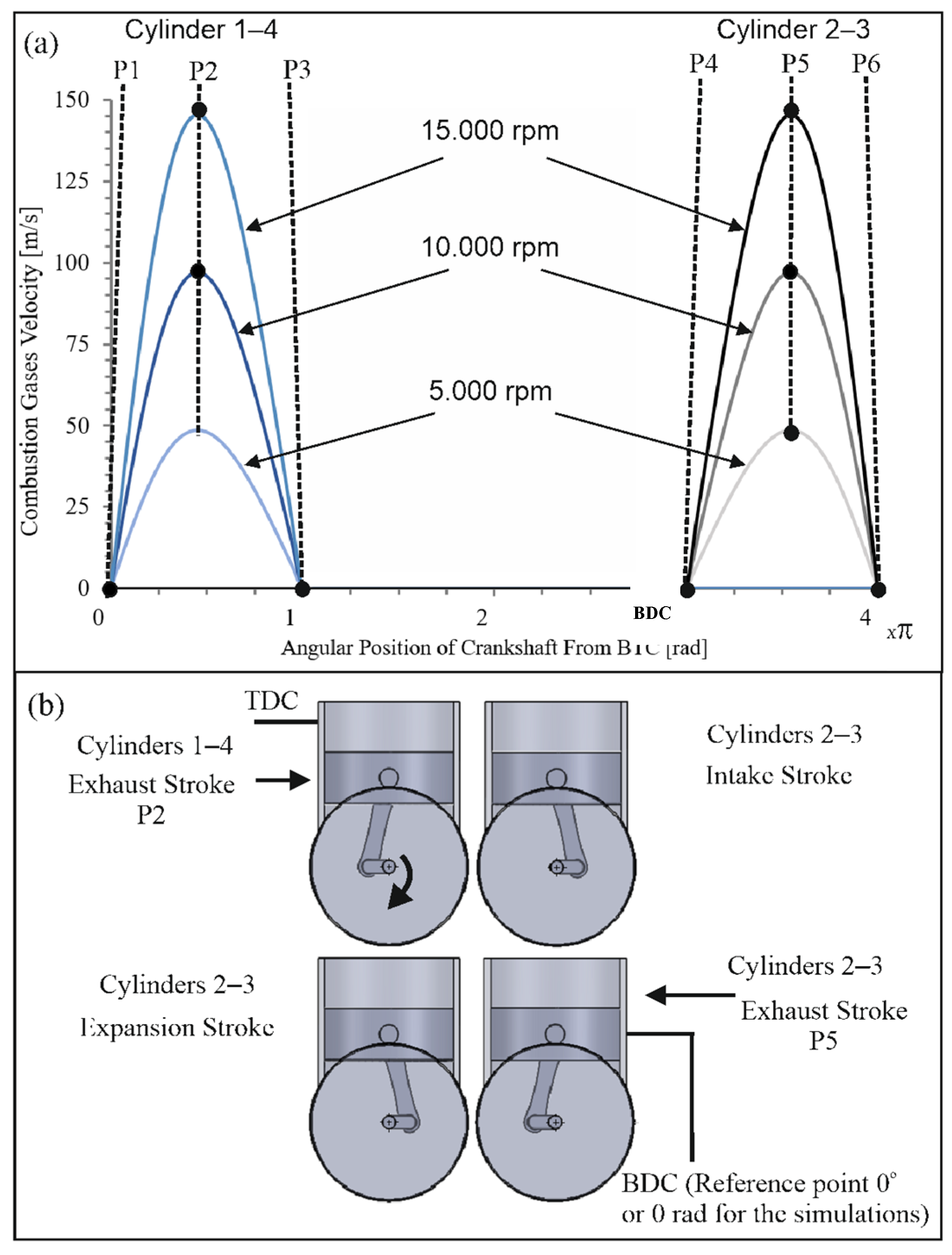 Figure 2 shows the piston velocity as a function of the crank angular position in radians during the exhaust process for the four cylinders of the engine. In these diagrams, the angular position of the crankshaft during the exhaust stroke for the four cylinders is illustrated. The points P1, P2, P3, P4, P5, and P6 correspond to the angular positions of the crankshaft during the exhaust stroke for the pairs of cylinders 1 and 4, and 2 and 3. In the figure, the angular position during the exhaust stroke for piston P2, where, according to Equation (1), the velocity of the piston is maximum. The simulation started at the moment when pistons 1 and 4 were at BDC. As previously explained, the worst-case scenario (maximum gas velocity for each engine speed case) was considered (e.g., the gas velocity at the exhaust manifold inlet equals the piston velocity during the exhaust stroke, and pressure loss in the cylinder head was not considered). Additionally, to simplify the problem and focus on the transient state of the exhaust stroke by observing maximum velocities, no overlapping period was considered.