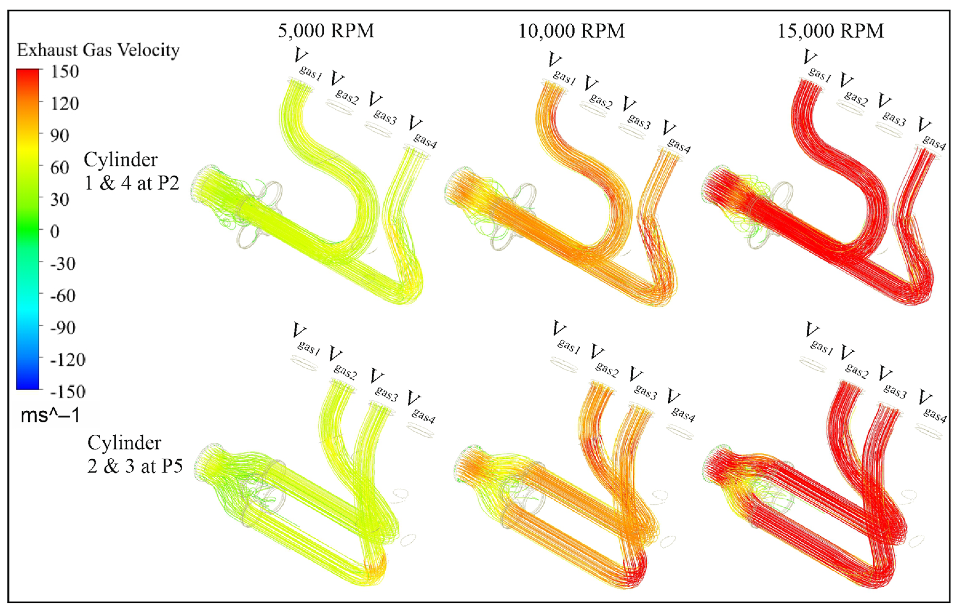 Figure 3 indicates the velocity streamlines for 5000, 10,000, and 15,000 rpm when the piston’s velocity becomes its highest values (P2 and P5 crankshaft angular positions). The first row shows the results for the exhaust stroke in cylinders 1–4, and the last row shows the exhaust stroke of cylinders 2–3. The streamlines in all cases show a decrease in velocity magnitude before the outlet, and some vertices appear at those points. The phenomenon seems to be more intense at 15,000 rpm.