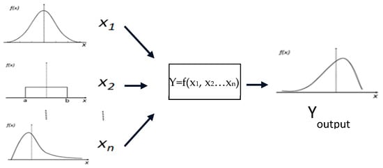 The uncertainty in a system can be present in multiple aspects, such as loading conditions or geometric and material properties. The deterministic approach assumes exact, fixed values for inputs like material properties, boundary conditions, and loading. On the other hand, the probabilistic approach [2,3] is a method used to account for uncertainty and variability in input data, model parameters, or environmental conditions when analyzing or designing systems. Instead of assuming that all parameters are fixed (as in a deterministic approach), the probabilistic approach treats key inputs as random variables with known or definable probability distributions. These distributions can assume any mathematically definable form. A common example is the normal (or Gaussian) distribution. This approach allows for the prediction not just of a single outcome, but a range of possible outcomes, each with a quantifiable likelihood [4]. By integrating the probabilistic approach into finite element analysis, the simulation is transformed from a single-point deterministic prediction into a statistical evaluation of the likelihood of various outcomes. This is typically achieved through techniques such as the Monte Carlo method [5,6,7], in which the model is executed repeatedly using input parameters that are randomly sampled from predefined probability distributions. This process results in a range of possible outputs rather than a single solution, allowing for the assessment of variability, the identification of influential parameters, and the quantification of uncertainty in the system’s response. Figure 1 illustrates the propagation of distributions for N = 3 independent input quantities.