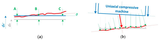 (a) Effect of lack of flatness and perpendicularity of the specimen side on the evaluation of the specimen dimensions (example on evaluating the dimension of the specimen parallel to the x-axis). Τhe red line represents a cross-section of the real surface of the specimen. (b) Imperfections in Load Application: Schematic showing the effects of non-perpendicularity in the moving platen of the uniaxial compression machine and non-flatness of the specimen’s upper face.