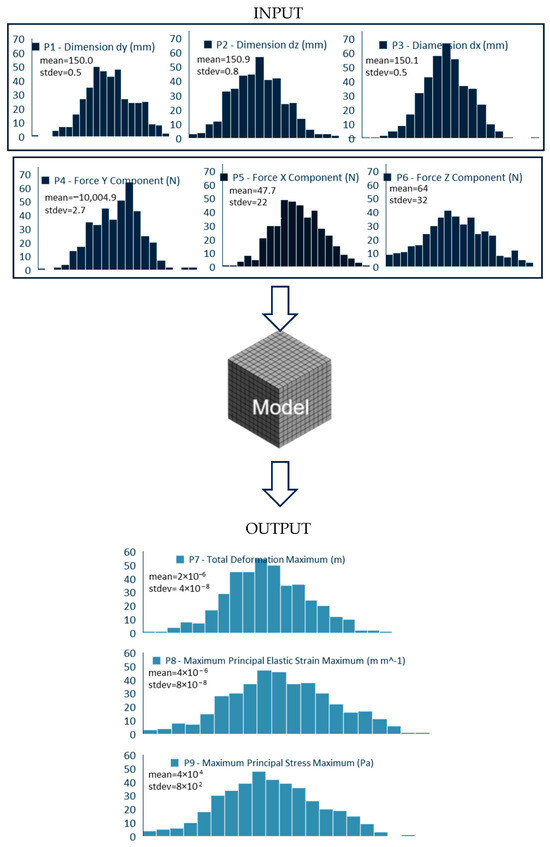 The method was used to determine the distribution of the output parameters based on repeats of the model solution using the first 404 generated sets of randomized values. The output parameter data were obtained in the form of a set of 404 values for each. As a result, each one of the three output parameter distributions (P7, P8, P9) was turned into a histogram, thus providing the exact range and shape of the output distribution (Figure 4). Figure 4 illustrates a probabilistic analysis workflow where input distributions of geometric dimensions and force components are propagated through a computational model, resulting in output distributions. This figure is similar to Figure 1, but the presenting distributions are made by the exact results of the applied method. The three histograms obtained for output parameters represent the distributions of response quantities obtained from the model. The statistical characteristics of the resulting distributions are presented in detail in Table 2.