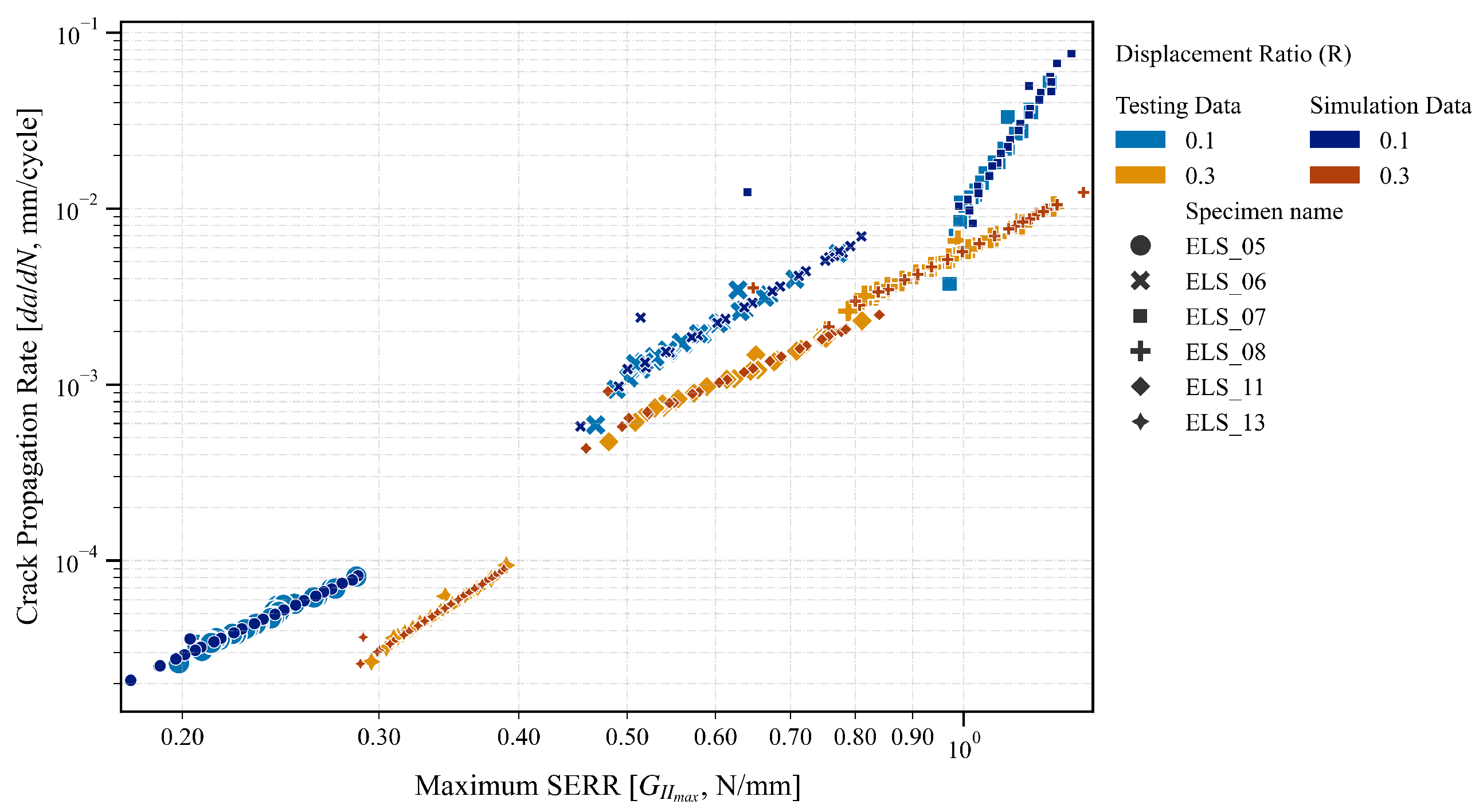 It is important to note that the slope for specimen ELS_07 exhibits the most significant deviation when compared to the others. This is because, at the specified energy level, the specimen did not transition into stable crack propagation. Instead, it exhibited high rates of crack propagation, which are characteristic of the unstable growth typically observed during the initial phase of delamination. Furthermore, all the tested specimens exhibit a slight change in slope as the delamination propagates. This change is due to the influence of the clamped end, which alters the stress ratio at a constant displacement ratio. These effects are effectively captured by the numerical model, which utilises the experimental parameters from the Paris curve as an input.