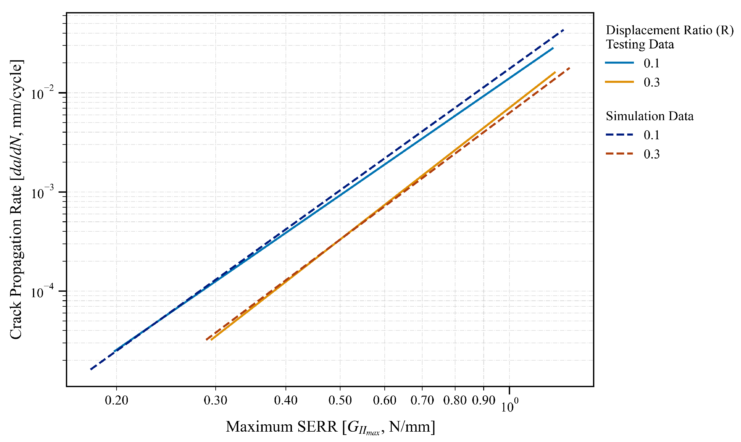 Figure 5 illustrates a single curve based on the Paris Law, encompassing all the data with the same displacement ratio for both numerical and experimental approaches. The coefficients of the Paris Law, derived from fitting the power function described in Equation (
