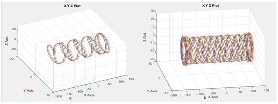 Simulink [28] was employed in this study as a modeling environment for the intuitive design and development of simulation systems through block-based modeling. Specifically, Simulink was used to construct a visually progressive representation of the FW process, capturing its temporal evolution and enabling detailed visualization of fiber trajectories, as illustrated in Figure 2. The model was driven by xx, yy, and zz coordinates derived from the differential Equation (3) introduced in a previous section. The mandrel is covered incrementally, layer by layer, reflecting the actual manufacturing sequence. A 3D block from the Simulink library was configured to accept the computed coordinates and render the fiber paths in three-dimensional space. These simulations can be integrated with physical filament winding equipment, allowing for real-time synchronization and monitoring of the fiber’s exact position. Additionally, the model supports defect prediction by identifying potential flaws during the winding process, thereby contributing to enhanced process predictability and quality assurance. Figure 3 presents the progression of the fiber deposition in the real-time simulation.