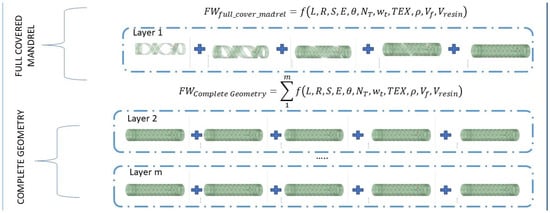 Initially, it can be observed that the conventional method requires two passes (±θ) to achieve full coverage of the mandrel. In contrast, the proposed methodology determines the full coverage of the mandrel by computing the minimum number of layers and their corresponding trajectories using the function in Equation (7), Equation (7), which depends on several parameters discussed in Section 4.2. This equation yields both the coordinates and the number of fibers required for complete single-pass coverage of the mandrel. In cases where a fully analytical geometry of a specified thickness (t) is required, the total number of layers must be summed to achieve the desired composite thickness. Consequently, the final geometry will consist of m layers, as derived from Equation (7). Therefore, to construct a fully developed geometry with the prescribed thickness (t), Equation (8) has to be evaluated.