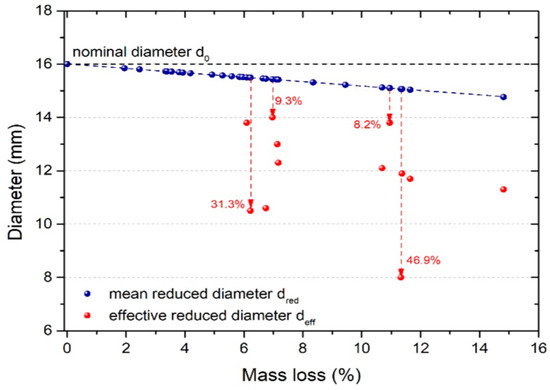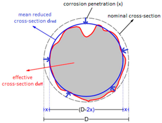 An experimental study [10] has shown the deviation of the equivalent reduced diameter dred calculated in terms of penetration depth (x) (corrosion penetration) from the actual reduced diameter deff. In order to highlight the differences between the simplified consideration of the uniform penetration type (x) with pits, the diagram in Figure 3 displays the values of the equivalent reduced diameter (dred) and the actual reduced diameter (deff). The use of the “penetration depth” is not a representative measure of the corrosion damage to the reinforcing steel, as it may deviate significantly from the actual corrosion damage caused to the material.