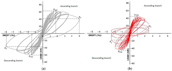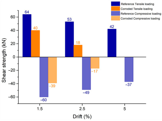 Figure 4 presents the results of an experimental study conducted at the Laboratory of Materials Technology and Strength of the Department of Mechanical and Aeronautical Engineering of the University of Patras [9], as part of the assessment of the mechanical behavior of a typical column (with a constant vertical load and horizontal increasing drifts) before and after corrosion, which demonstrated a significant deterioration in service life and shear strength in both the ascending branch (tension) and the descending branch (compression) (Figure 5). The above results of the seismic behavior of corroded R.C. columns are in good agreement with similar scientific studies [7,14,15].