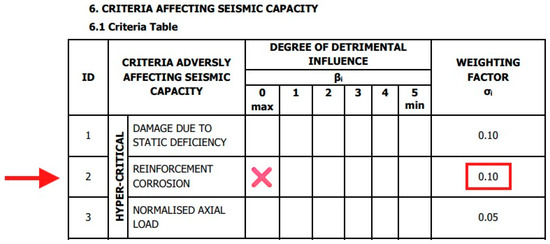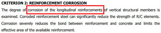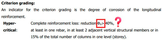 According to the proposed methodology of the 2nd Pre-earthquake Inspection, the vulnerability factors that decisively influence the seismic behavior of a building are summarized in 13 criteria of seismic vulnerability, each of which is rated on a scale of 1 to 5, where 1 corresponds to the highest level of negative impact (i.e., reduction in seismic resistance) and 5 corresponds to the lowest level of negative impact. In addition, a criterion is classified as critical when its intensity and extent exceed a threshold beyond which the overall stability of a building is compromised. In the 2nd degree Pre-earthquake Inspection, only three criteria can be classified as hypercritical, including the corrosion of steel reinforcement. An indicator for calibrating this criterion is the degree of corrosion damage of the longitudinal reinforcement only [4], where if the engineer finds complete loss of reinforcement, i.e., a reduction of Φd > 40%, at least at one bar, in at least two adjacent vertical elements or in 15% of the total number of columns on one level, this criterion is translated as critical. Excluding the influence of all other seismic load criteria and taking into account the weighting factor of the ‘Reinforcement Corrosion’ due to the negative effect of steel corrosion, the shear strength of the building is reduced by only 10% (Figure 6).