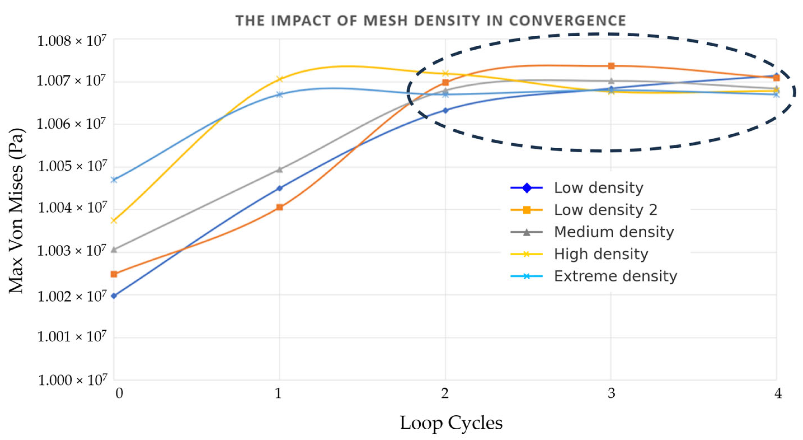 Figure 2). Five different initial mesh densities were considered: Low density 1, Low density 2, Medium density, High density, and Extreme density, to examine the effect of starting element size distribution on convergence. Low density 1 and Low density 2 correspond to two independent coarse meshes with slightly varied initial discretizations, included to confirm that the convergence behaviour was independent of the starting mesh configuration. Results demonstrated that beyond two refinement cycles, stress variations became negligible across all initial densities, confirming mesh independence. All simulations were therefore conducted with four refinement cycles, ensuring a balance between accuracy and computational efficiency.