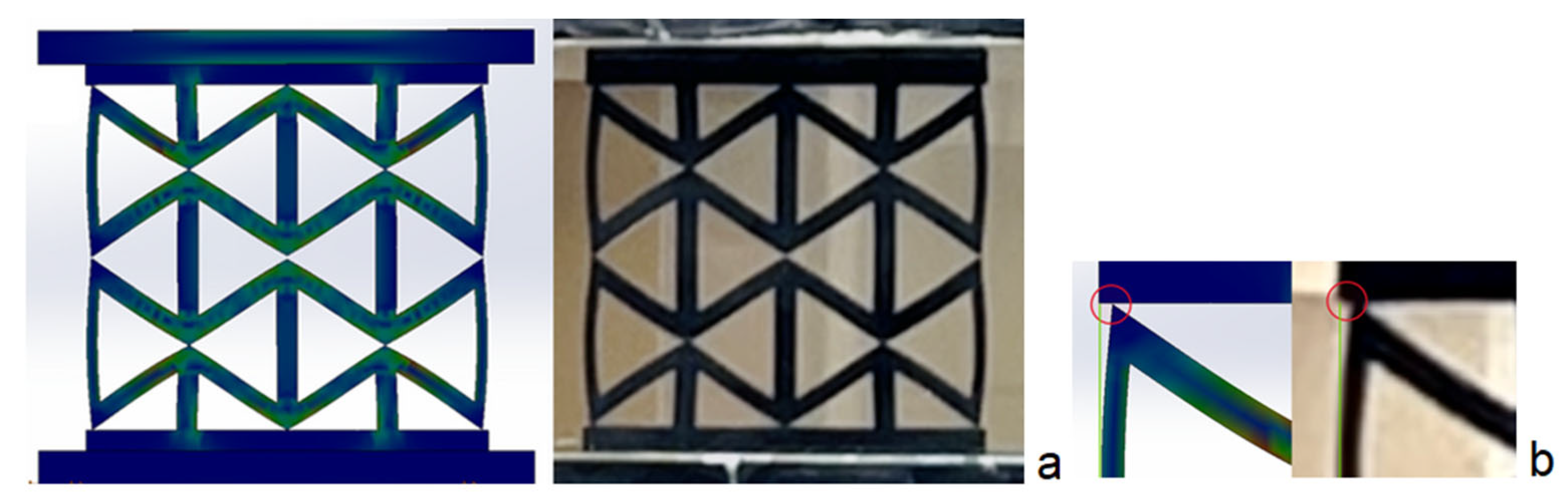 Quasi-static tests in compression and tension were carried out on an InstronTM 4482 universal testing machine (Instron, Norwood, MA, USA). For compression, the crosshead applied a 12 mm total displacement at a speed of 5 mm·min−1. For tension, specimens were pulled to failure at a constant rate. Deformation was recorded using the machine extensometer and synchronized photos, allowing qualitative comparison of deformation modes between experiment and simulation. For the elastic-range validation, the reference lattice was compressed to 3 mm axial displacement so that direct comparison with the linear simulations was possible.