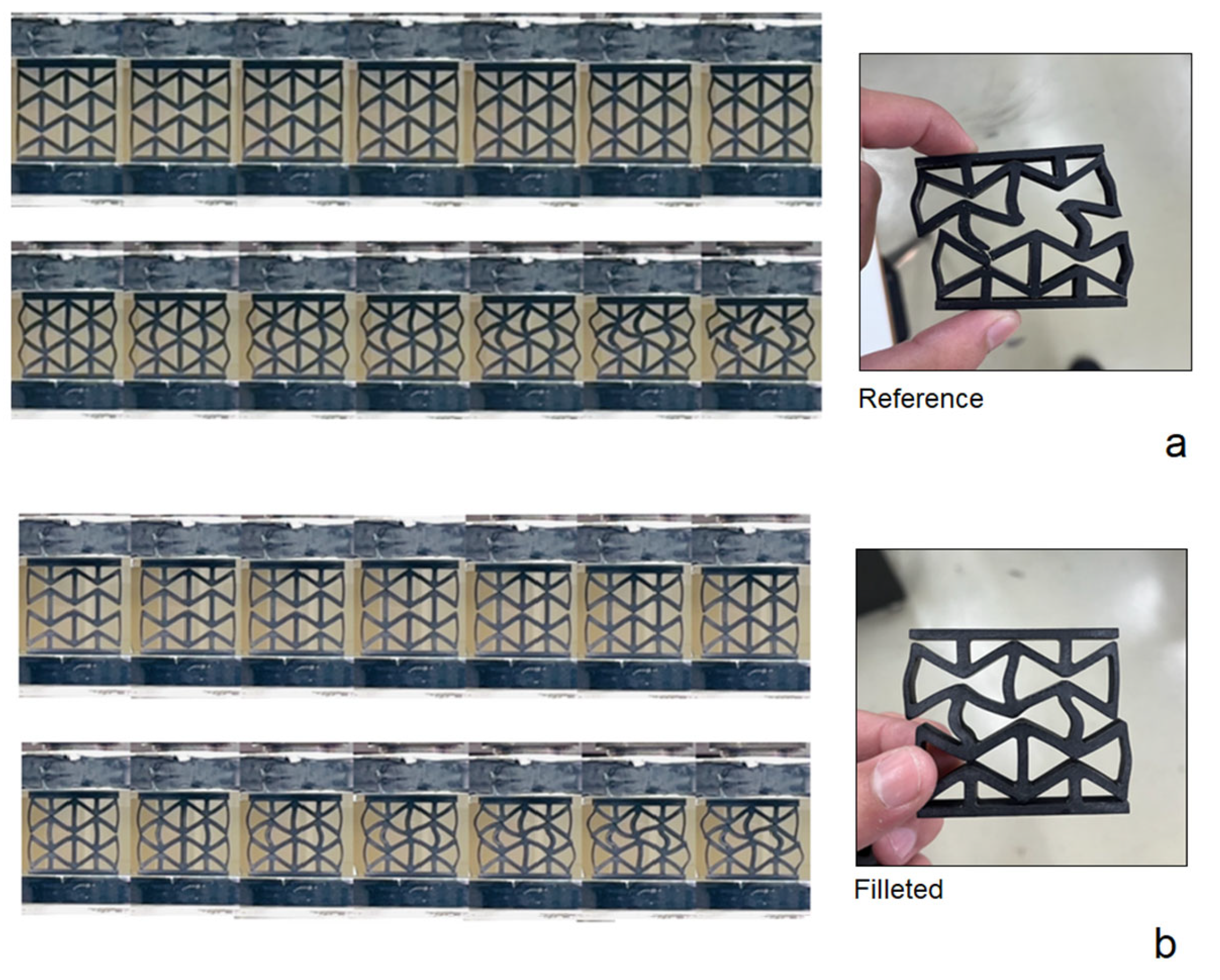 Figure 9) illustrate this difference clearly. Although the reference design sustained a slightly higher peak load, it failed catastrophically at small extensions. The filleted variant reached a lower maximum load but accommodated a much broader strain range and absorbed slightly more energy (4.18 J versus 4.10 J). This trade-off emphasizes that while peak strength is reduced, ductility, toughness, and predictability are enhanced. Such a response is especially valuable in applications where large reversible deformations and avoidance of sudden fracture are critical, such as biomedical implants or energy-absorbing systems.