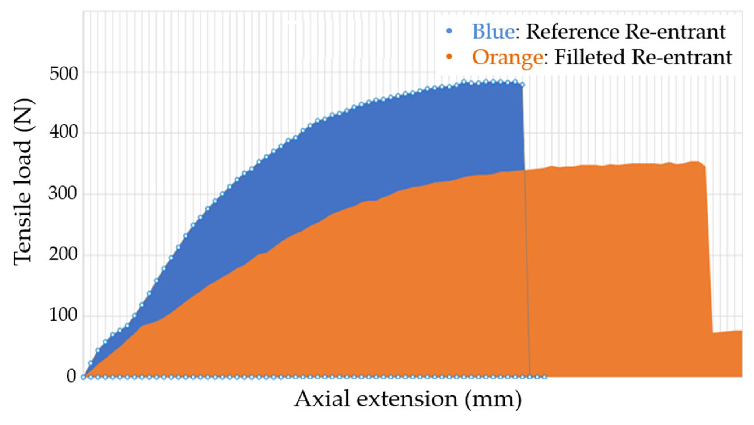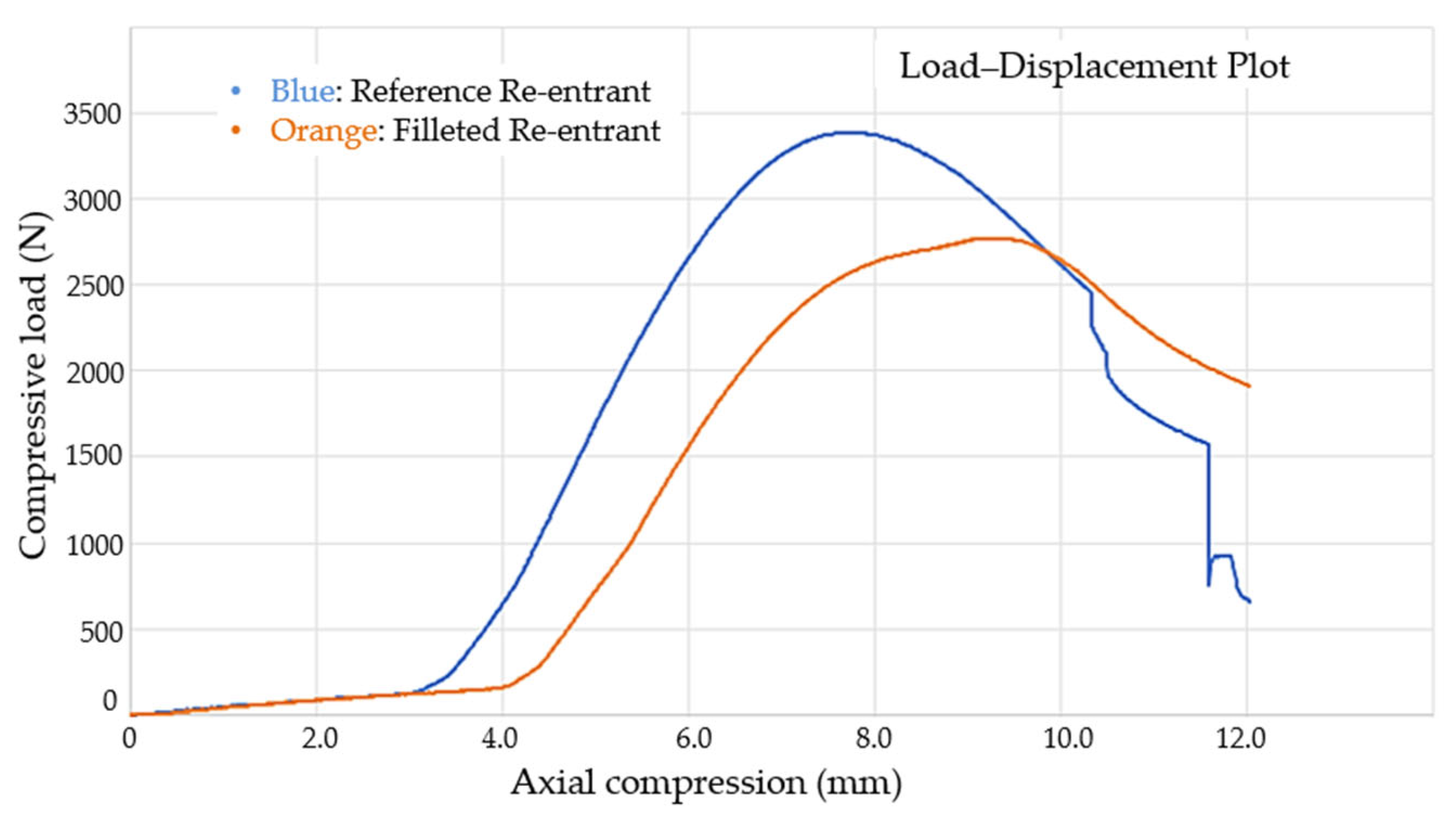 Figure 6). The reference geometry reached a higher peak load (~3.4 kN) but exhibited brittle collapse immediately afterward. Conversely, the filleted geometry sustained a lower maximum load (~2.7 kN) earlier peak and smoother post-peak response, thus preserving stability over a wider strain range and delaying catastrophic failure.