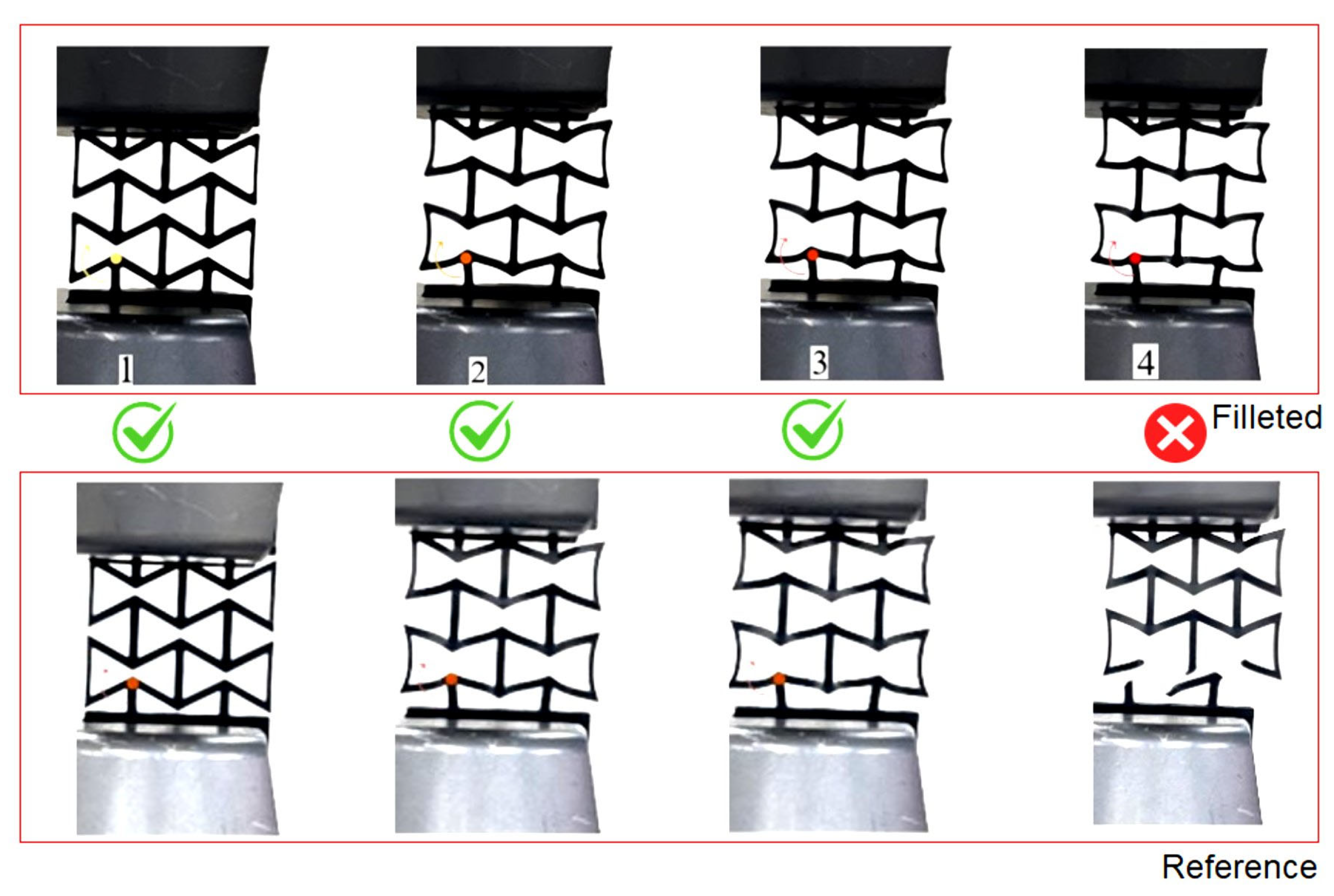 Beyond the elastic region, clear differences emerged between the two geometries. The deformation sequence of the reference and filleted re-entrant structures is presented in