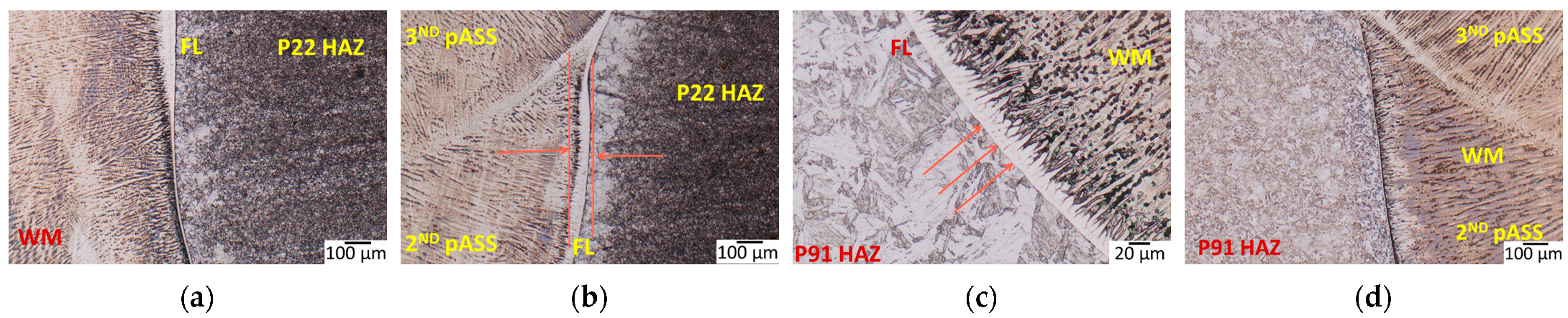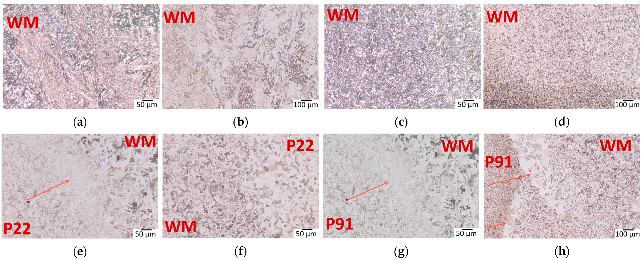 - Sirohi, S.; Gupta, A.; Pandey, C.; Vidyarthy, R.S.; Guguloth, K.; Natu, H. Investigation of the microstructure and mechanical properties of the laser welded joint of P22 and P91 steel. Opt. Laser Technol. 2022, 147, 107610. [Google Scholar] [CrossRef]