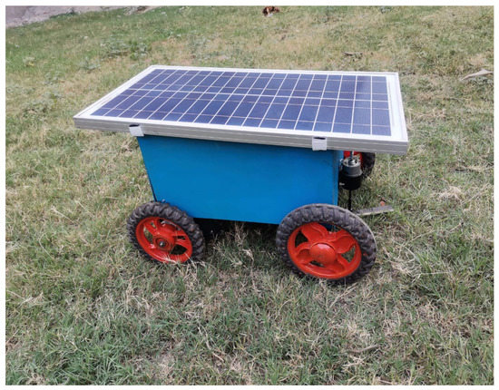 The project aims to use renewable energy sources like solar electricity and to operate a cutter equipped with various accessories and to cut and gather lawn grass. The DC motor, powered by a battery, where the charge is kept via a solar panel, has a spiral shaped grass cutting blade. This is also shown in Figure 2. In a framework of metal rolls, the complete structure is supported. The solar panel is attached to the structure and charges if the system does not run, transferring charges to the battery through the circuit. During the day and night, the solar grass cutter uses both. The grass cutter backup battery is 2 h, so, at night, we simply use a cutter. The chassis is powered by the blade engine, DC engines, solar panel, and batteries. Specifications of the components used are mentioned in Table 1.