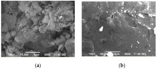 Surface compactness of WC and PANI-WC was studied with SEM and the pictures are shown in Figure 1a for Wc and and Figure 1b for PANI-WC. WC is comprised of irregular pills and uneven particulates. About 1.75 μm mean particle size was observed for the WC powder. Certain pores and cracks were observed in WC and PANI-WC surfaces, which are assigned to be produced during heating process of samples in oven. PANI-WC shows even morphology which is referred to as the regular dispersal of wastes masses in the polymer medium. It means that there is a stable halt of WC particles on the PANI interchains.