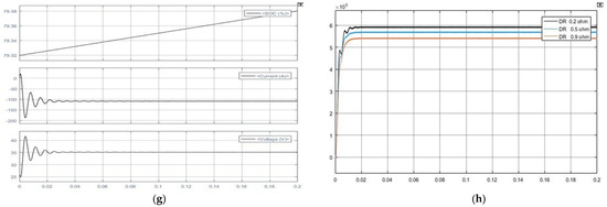 This figure shows simulation results; scope waveforms of boost converter without and with stability: (a) with droop resistance of 0.2 Ω (b) with droop resistance of 0.8 Ω. Scope waveform of buck converter without and with stability, (c) without stability technique, (d) after applying 0.2 Ω droop resistance and (e) after applying 0.8 Ω droop resistance. Results of battery model without and with stability, (f) scope waveform of battery attached with proposed circuit without stability, (g) Scope waveform of battery attached with proposed circuit after stability technique is applied, (h) Scope waveform of Impact of different droop resistances on Voltage output.