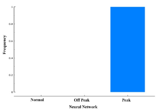 On the bases of these training results, we found that an ANN is the most suitable form of algorithm to use for the classification of residential load patterns. Then, we used the testing data to test whether our machine predicted the load pattern accurately or not. Figure 6 shows the testing model of the ANN. Here, we inserted the test file, and the predictor classified the data pattern of the test file. We obtained patterns of the peak load, and our machine classified it accurately. Figure 7 shows the prediction result of testing.