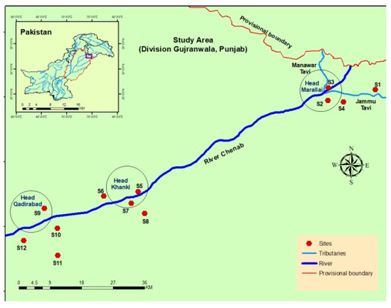 Location of study area (Head Maralla, Head Khanki and Head Qadirabad) at River Chenab.