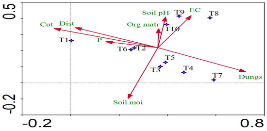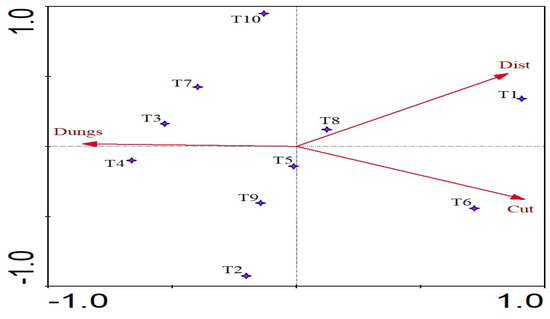 The distribution of sites investigated using DCA tools proved clustering results and also showed that different anthropogenic variables such as animal dungs, nearby construction sites and cut marks have a significant correlation with the study sites. We have assessed the relationship between environmental variables at the sites (Figure 2). CCA by using anthropogenic predictors such as cut marks, animal dung and distance from the nearby construction sites was analyzed (Figure 3). Some previous studies have determined the anthropogenic effect on the other side of the country (Sarwar and Qaiser 2012).