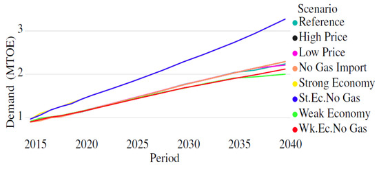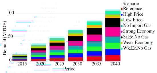 In the different scenarios, electricity demands were almost four times over those of the outlook year, increasing from 7.71 million tons of oil equivalent (MTOE) in 2015 to 29.77 MTOE by the end of 2040, as shown in Table 1. Residential electricity demands will be more than five times those of the forecast year in 2040, though the overall share of residential in electricity consumption will fall slightly from 54.36% in 2015 to 44.36% by 2040. In the commercial sector, the demand for electricity will be 11.88%, slightly lower than 7.53%.