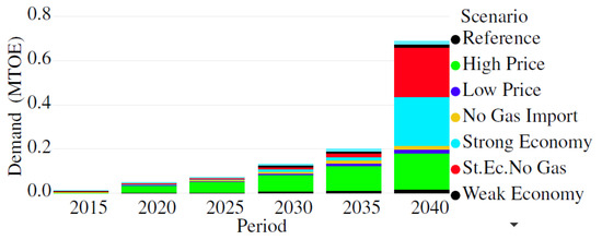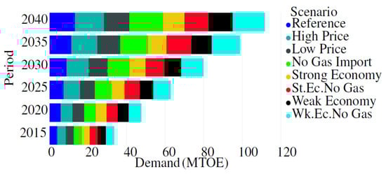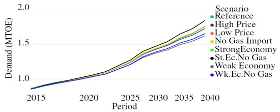 In commercial sectors, the demand for electricity was 11.88%, which falls slightly to 7.53% over the outlook period. Figure 3 reveals that the total demand in 2015 for the reference scenario was 0.92 MTOE and in 2040 it will be 2.24 MTOE, almost 2.5 times more than the base year of 2015.