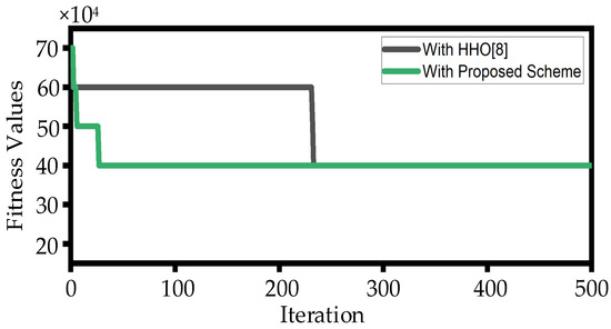 The performance of the proposed scheme is evaluated on the standard IEEE-8 bus system, which is modified with the integration of two wind farms (WFs) at bus three and six. As we will compare the results with the HHO used in [6], the same system as used in [6] is used here. The one-line diagram of the IEEE-8 bus system is shown in Figure 1. The three-phase bolted faults are simulated at the mid-point of each line. There is a total of seven faults, represented as F1–F7. The system is protected with 14 DOCRs and there is a total of 20 primary/backup relay pairs. The coordination time interval (CTI) is kept as 0.3 s. The lower and upper limits for TDS are 0.05 and 1.1, whereas, for Ip, these are kept as 1.1*Iload and 1.5*Iload. The objective functions given is to minimize total relay time and is evaluated with HHO [6], and proposed α-HHO with DOCR-TCV. For both algorithms, the population size is 30 and the maximum iterations are 500. The relay settings obtained with HHO and α-HHO are reflected in Table 2. The operating time of the primary/backup relays of each pair is shown in Table 3. The overall operating time for the relays with HHO is 67.9 s, whereas, with α-HHO, it is 25.63 s, which is 62.25% less than HHO. Additionally, no CTI violation is recorded, which shows the better performance of α-HHO as compared to conventional HHO. Figure 2 reflects the convergence graph for both HHO and α-HHO.