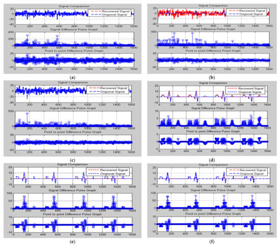 Adaptive filtering results using RLS and LMS, respectively. Each figure contains three outputs from top to bottom: Point to point difference pulse graph, signal difference pulse graph, and the reconstructed signal, respectively. (a) Result of Haar Wavelet by applying the adaptive filtering technique (RLS) (b) Result of Daubechies Wavelet by applying the adaptive filtering technique (RLS) (c) Result of Coiflet Wavelet by applying the adaptive filtering technique (RLS) (d) Result of Haar Wavelet by applying the adaptive filtering technique (LMS) (e) Result of Daubechies Wavelet by applying the adaptive filtering technique (LMS) (f) Result of Coiflet Wavelet by applying the adaptive filtering technique (LMS).