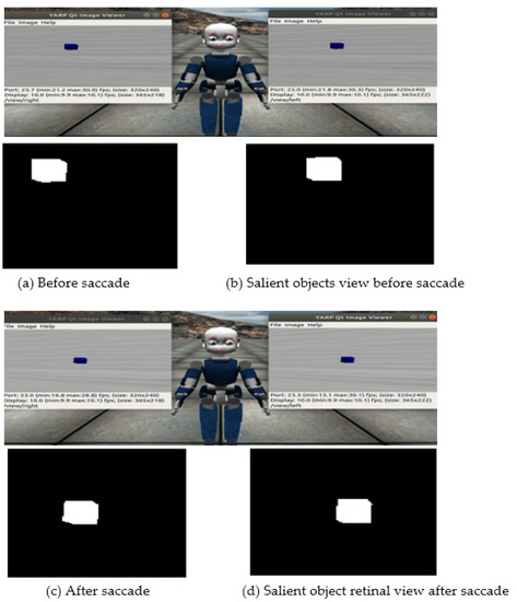 Figure 1. Humanoid robot iCub simulator’s saccadic eye movements with reference to learnt motor commands. (a) represents the object location at retina of both eyes before saccadic movements; (b) shows object retinal view of both eyes before saccadic movements; (c) shows saccadic movements of eyes by learnt motor. (d) shows saccadic retinal view of eyes by learnt motor after saccade.