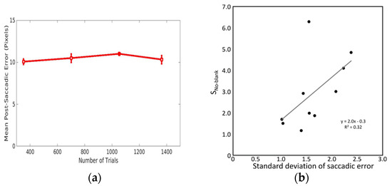 Figure 2. Saccade accuracy. (a) represents the mean post saccadic distance error of described model; (b) shows relationship with standard deviation of saccadic error.