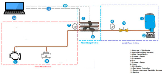 To calculate the EERs for various evaporators, cooling effects produced had to be calculated. For this purpose, the HCACS experimental setup schematic is shown in Figure 1. Liquid LPG, which is widely available on the market, was stored in a cylinder at high pressures of up to 413 kPa. To obtain the liquid LPG, the cylinder was kept inverted during experiments. The cylinder with a flow control valve directed the liquid LPG towards the system’s evaporator. The liquid LPG interacted with the air flowing over it, absorbing its latent heat; as a result, the LPG vaporized in the evaporator, and the interacting air cooled.