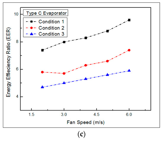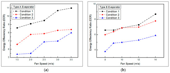 For condition 1, the highest EER was recorded for type A evaporator, i.e., approximately 11 at a very low fan velocity of 3.5 m/s. The minimum EER for type A evaporator was approximately 8.5 at a fan velocity of 1.5 m/s, which was approximately the maximum EER of condition 1 for the other two evaporators at high speeds of the fan, i.e., 14 m/s for type B evaporator and 6 m/s for type C evaporator. Under same conditions, it can be observed that the EER of type A evaporator was higher than those of the other two evaporators at low speeds of 1.5 to 3.5 m/s.