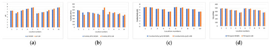 Figure 2. Comparison between average values of water quality from WQMS and testing lab: (a) pH; (b) turbidity; (c) conductivity; and (d) TDS.