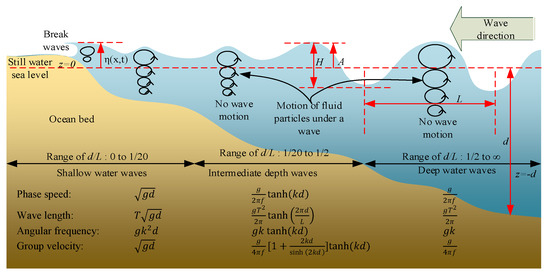 The determination of the parameters that are the most pertinent to ocean wave hydrodynamics is the first step in identifying the wave resources at a particular region of ocean space. Wave height, wave period, and wave direction are apparently the most relevant parameters to be investigated at the site of interest for the characterization of wave resources. However, there are other detailed parameters that are the basis of linear wave theory. Linear wave theory is a well-established theory concerning the hydrodynamics of waves, and it is explained in many books [6]. Although it has some limitations, it provides a basic theoretical rationale for wave modelling. Linear wave theory has the following assumptions: (a) the water depth is constant, (b) the wave motion is two-dimensional, (c) the waves are time independent, (d) the water is incompressible, (e) the viscosity, surface tension, and turbulence of the fluid (water) are neglected, (f) the wavelength L is large compared to wave height H, and (g) the water depth d is large compared to the wave height H. The phase speed of ocean waves varies with the depth of the water, and with a constant ω and k, waves will propagate at a faster phase speed in a deeper ocean. Similarly, the wavelength L of water waves will also change with the change in the water depth. The relations for phase speed, wavelength, angular frequency, and group velocity are shown in Figure 2. The direction of wave propagation, the varying ocean depth, and the induced waves are represented with a sketch in Figure 2.