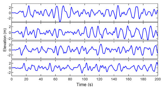The obtained wave elevation profile for 200 s duration for , respectively.