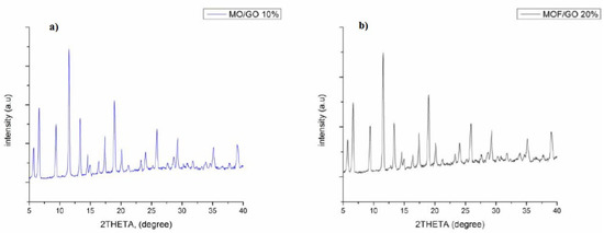 Figure 1. The MOF/GO composite exhibited well-defined MOF present in the prepared composites. Hence, it can be presumed that GO did not obstruct the formation of linkage among Cu dimers and organic linkers. Another interesting fact is that the broad GO peak did not appeared in the composites pattern. The reason can be dispersion of GO during the synthesis of MOF/GO composites.