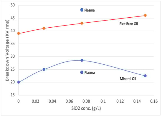 - Zakaria, I.H.; Ahmad, M.H.; Abdul-Malek, Z.; Sidik, M.A.B.; Nawawi, Z.; Jambak, M.I. AC breakdown strength performance of plasma treated mineral oil-based nanofluids. In Proceedings of the International Conference on Electrical Engineering and Computer Science (ICECOS), Palembang, Indonesia, 22–23 August 2017; pp. 333–337. [Google Scholar] [CrossRef]