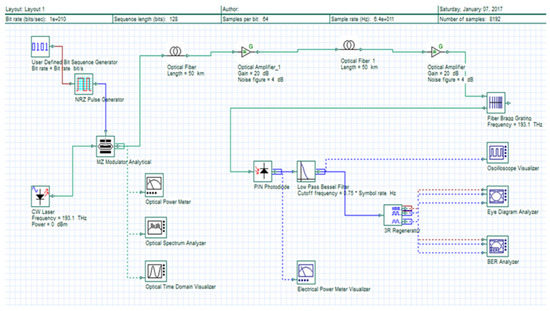 As shown in Figure 1, the optical communication link was designed using OPTISYSTEM 7 software. The optical system in the figure contains a bit sequence generator from which we can change the data rate. This defined bit sequence is fed into the pulse generator, where NRZ modulation format is used to compare the Q factor. The generated electrical signal is the input of Mach Zehnder modulator that combines the modulated pulse with the CW laser. Apodization parameters tanh, Gauss, and uniform are used for finding the optimal Q factor. The resulting signal of the MZ modulator then travels from two single-mode fibers (SMFs) of 50 km separated with optical amplifiers of EDFA with a gain of 20 dB. Forty gigabytes per second of bit data, after travelling 100 km, are fed into fiber Bragg grating, which reduces the unwanted dispersion in the signal. A low-pass Bessel filter is used to limit the noise power. The results are measured using a BER and eye diagram analyzer.