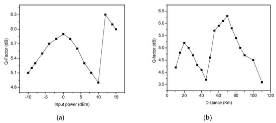 The next phase is to define the optimal input power for communication link that gives maximum Q factor. CW laser input power varies within a range of −10 dBm to +15 dBm. Power less then −10 dBm is not chosen because of low OSNR, and the power chosen must not be greater than +15, as this causes nonlinear effects to the system. The following Figure 3a shows that simulation result of input power of CW laser. The graph shows that the optimal value of input power is +12 dBm, which gives the high Q factor to the designed optical system. After finding the optimal values of FBG performance and input power of CW laser, the next parameter is an amplifier span length (La). This is the distance at which the optical amplifier would be placed from the transmitter end. EDFA with the gain of 20 dBm and noise of 4 dBm is used for this simulation.