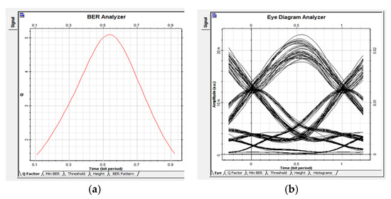 All the optimal values of parameters found above are then fed into the system as input in Figure 1. The final simulation values are shown Figure 4b below. The results show a Q factor of 9.58 dB, BER of 4.34 × 10−10, and Eye Height of 1.61.