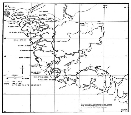 The Indus deltaic area of 170 km off Karachi is a complex area. This region has a meandering network of creeks (Figure 3). Tidal water during high and low tides moves in and out of these creeks during ebb and flow tides at velocities of 0.2–0.5 m/s [3]. In other parts of coastal Sindh, seawater moves inland up to 60 km due to lower land elevation and intense tidal fluctuation. These locations are also favorable for energy extraction from tidal currents. Pakistan’s coast experiences two semidiurnal tidal cycles. High and low tides ranging between −0.1 and 4.5 m have the potential for harnessing the energy to produce electricity.