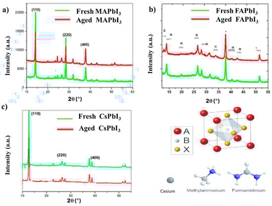 The XRD analysis was examined for FAPbI3, MaPbI3, CsPbI3 fresh and aged samples in Figure 1a–c, respectively. The aged FAPbI3 shows degradation issues after two weeks and appears the non-perovskite δ-FAPbI3 phase. This is verified by the augmentation of the peak characteristic of the δ phase, located at 12.6°. In the case of the sample CsPbI3 aged, no additional peaks were shown, compared to the aged MAPbI3, which demonstrated a dissociation of film into PbI2.