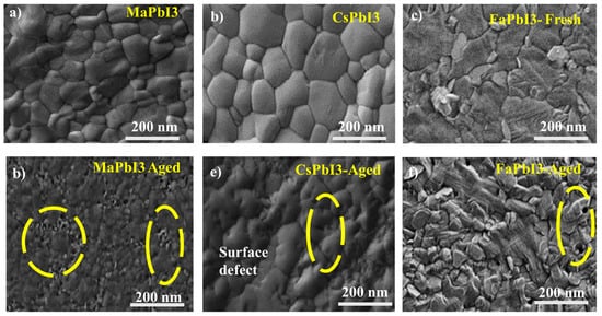 SEM images of APbI3 where A = (Ma/ Fa/Cs) (a) Fresh MaPbI3 Film (b) Fresh FaPbI3 Film (c) Fresh CsPbI3 Film (d) Aged MaPbI3 Film (e) Aged CsPbI3 Film (f) Aged FaPbI3 Film.