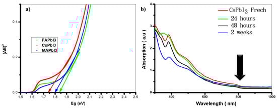 (a) Bandgap of APbI3 where A = Cs, FA, MA, (b) the absorption of CsPbI3 aged.