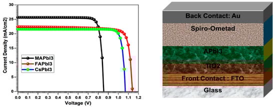 The performance FTO/TiO2/APbI3/Spiro-Ometad/Au of solar cells where FTO is the back contact [] through changes in the bandgap, SCAPS-1D software was used. The simulation parameters of APbI3 were taken from our previous calculations, where the bandgap varied from 1.7 to 1.8 eV. Figure 4 shows the J-V characteristic curve; the P-V curve shows that the maximum power is for FaPbI3 and CsPbI3. On the other hand, CsPbI3 demonstrates the stable performance of solar cells (Table 1).