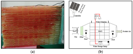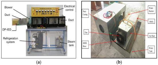 The air conditioning laboratory unit (ACLU) is used to connect to the DP-IEC. The air conditioning laboratory trainer (ACLT) is designed to validate the operation and performance of the ACLU. It is designed to create various conditions and environments. It also controls the airflow for certain processes such as cooling, pre-heating, re-heating, humidifying, and de-humidifying. It is designed to investigate primary factors that are controlled in a conventional air conditioning system. When using this system, the required temperature and humidity values must be set. This system is tested under a wide range of temperatures, which vary from 30 to 49 °C, while the other parameters such as velocity (6.1 m/s) and water temperature (20 °C) are fixed. Another parameter is the relative humidity, which varies from 13 to 20% of dry air during the experimentation. The DP-IEC is coupled at the outlet of the air conditioning laboratory unit, as shown in Figure 2a. The DP-IEC is also integrated with PV solar panels to fulfill the electricity consumption of the system. The DP-IEC consists of the HMX, water pump, and axial fan, which has a total power consumption of 0.70 kWh, as shown in Figure 2b. The required power for the axial fan and water pump is easily achieved by installing the PV solar panel setup.